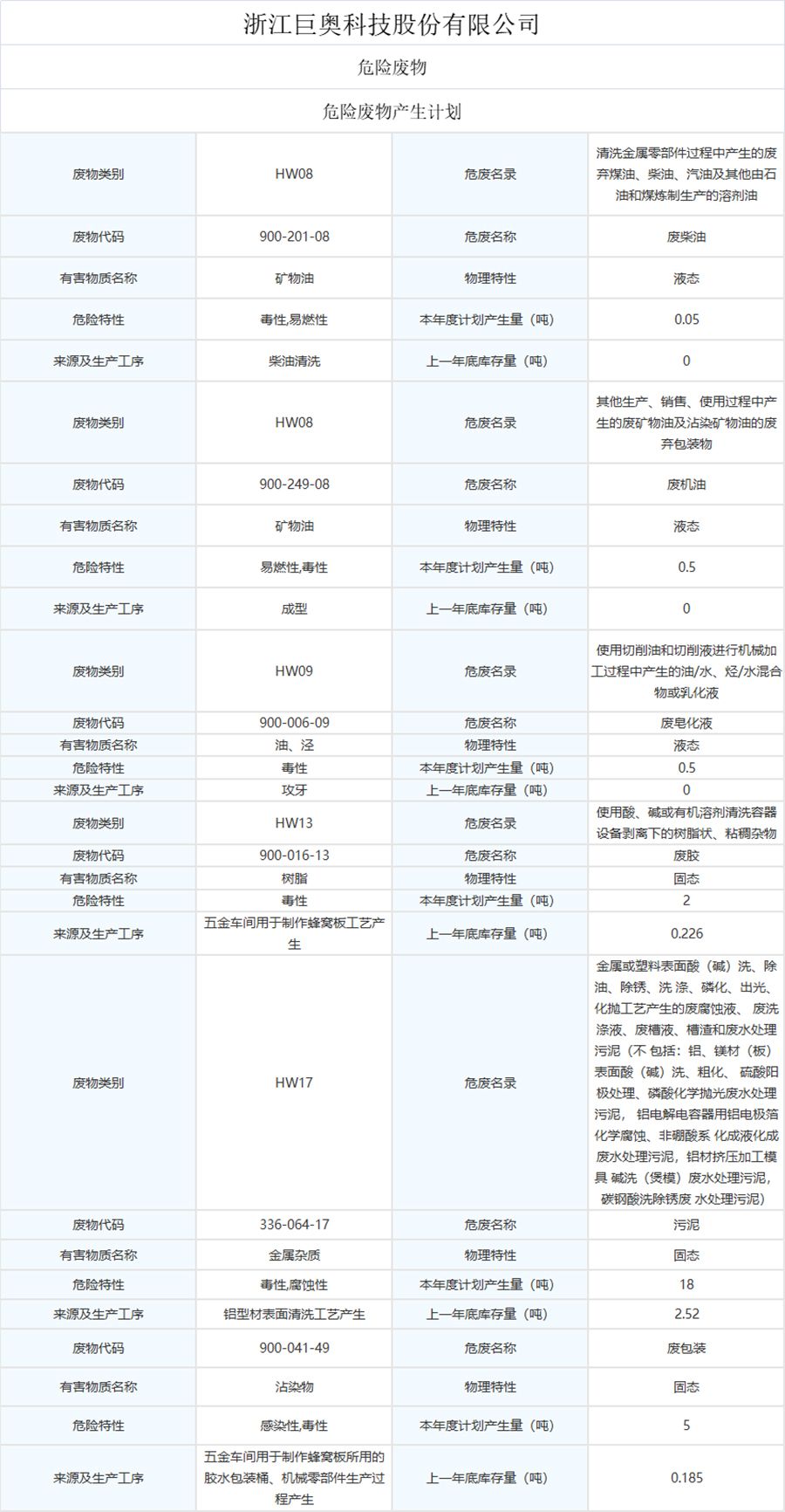 公示通知丨浙江巨奧科技股份有限公司生產(chǎn)廢物處置事項